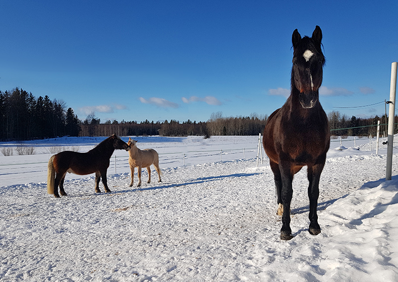 kun isoille puoliverisille naapurikarsinassa. Kyseessä oli perusluonteeltaan hieman arka hevonen, joka stressasi kyllä ratsastaessakin. Mutta ruoka maistui, ja se sujahti vaivattomasti myös laumaan.